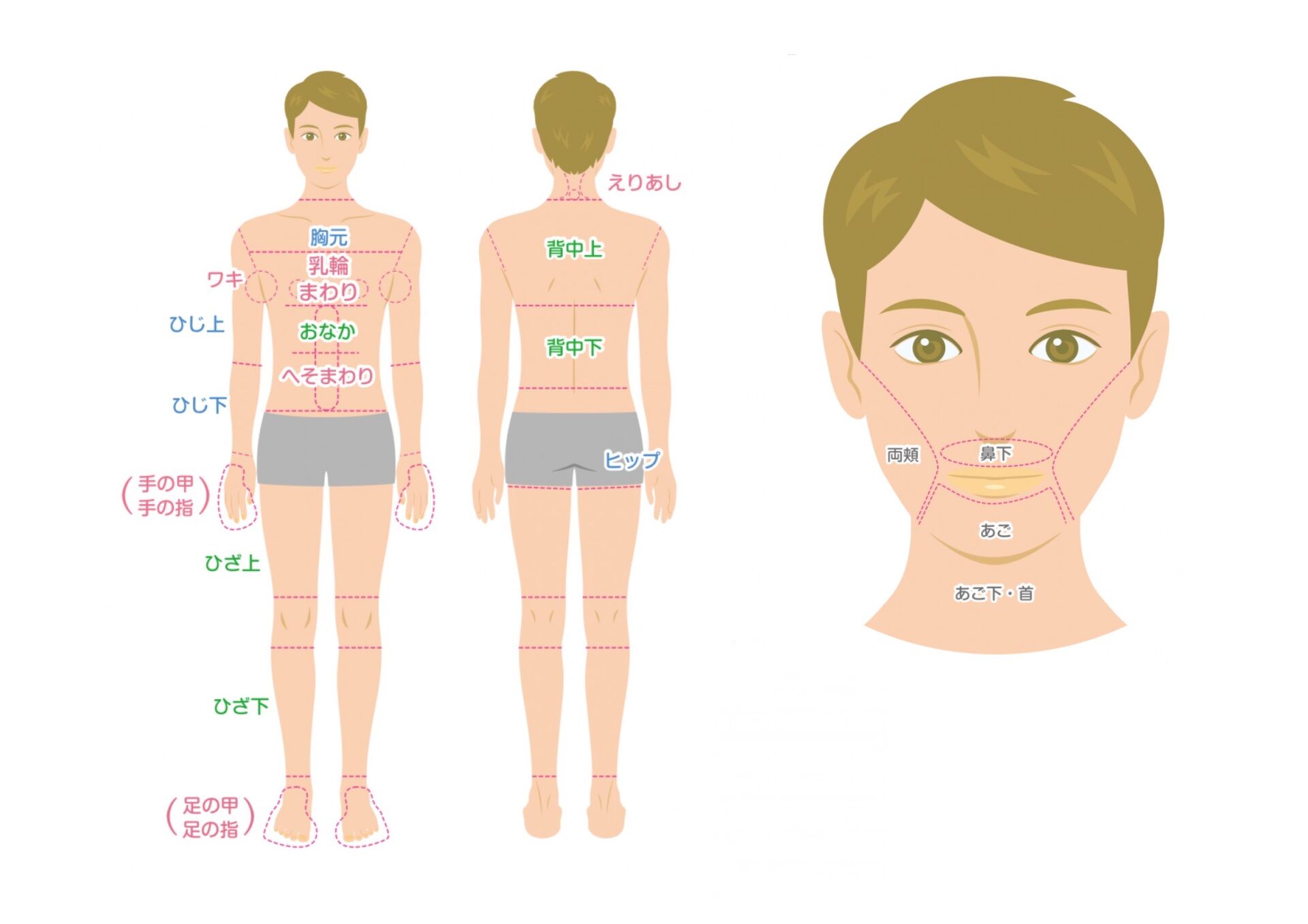 おでこから足先までできます。(陰部は除く)